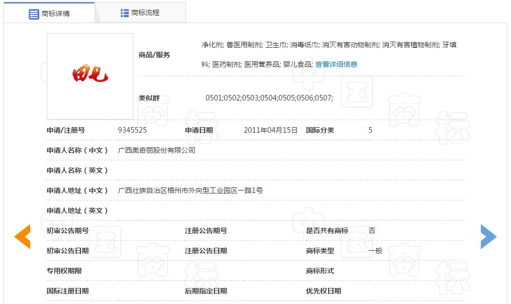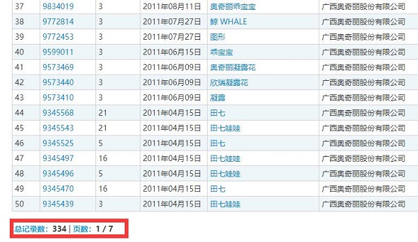根據(jù)商標局查詢,奧奇麗公司共申請注冊了334件商標,包括“田七、奧奇麗、強力”等等。這次拍賣的便是“田七”系列的商標。