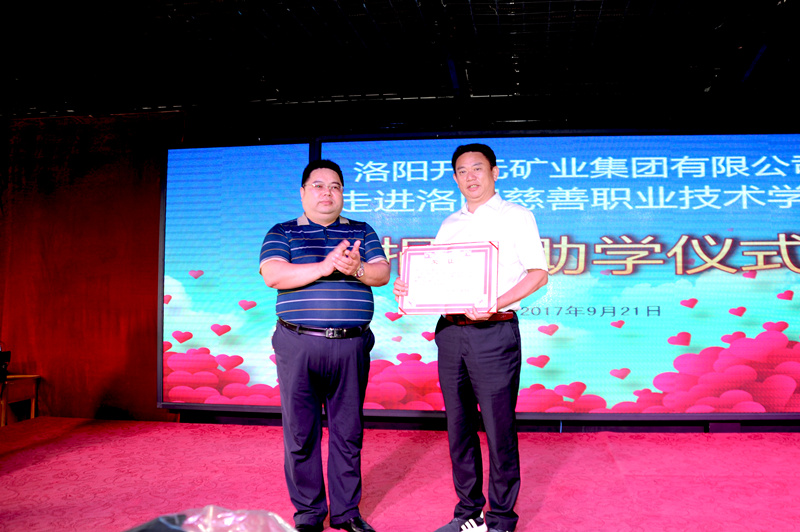 集團副總經(jīng)理楊春生代表洛陽開元礦業(yè)集團向洛陽慈善職業(yè)技術(shù)學(xué)校捐贈新生校服西裝,洛陽慈善職業(yè)技術(shù)學(xué)校賈國彪校長為洛陽開元礦業(yè)集團有限公司頒發(fā)榮譽證書,并向全校師生展示新校服。