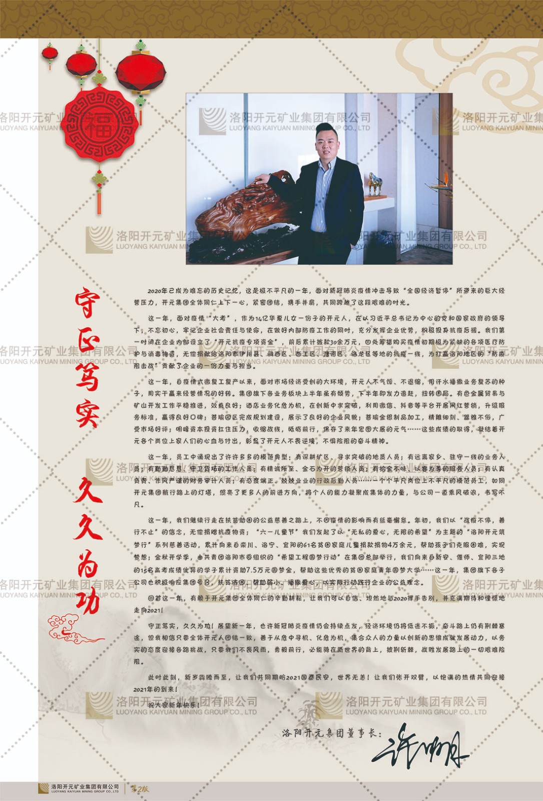 洛陽(yáng)開元礦業(yè)集團(tuán)有限公司簡(jiǎn)介洛陽(yáng)開元礦業(yè)集團(tuán)有限公司,始成立于2006年,位于洛陽(yáng)市開元大道269號(hào)。集團(tuán)旗下共有五余家全資子公司,業(yè)務(wù)涉及有色金屬礦山開發(fā)、礦產(chǎn)品購(gòu)銷與進(jìn)出口貿(mào)易、房地產(chǎn)開發(fā)、文化藝術(shù)、企業(yè)管理與咨詢、資本投資等多個(gè)領(lǐng)域。民建河南省委委員、民建河南省委企業(yè)委副主任、民建洛陽(yáng)市委委員、企業(yè)委主任、洛陽(yáng)民建企業(yè)家協(xié)會(huì)會(huì)長(zhǎng)許明月是公司創(chuàng)始人,現(xiàn)任洛陽(yáng)開元礦業(yè)集團(tuán)有限公司董事長(zhǎng)。在礦業(yè)領(lǐng)域,洛陽(yáng)開元礦業(yè)集團(tuán)擁有多家實(shí)力雄厚的子公司:貴州開元礦業(yè)有限公司探、采礦權(quán)面積共11.33平方公里;興??h銅鑫礦業(yè)有限公司探礦權(quán)面積8.76平方公里,礦山資源潛力巨大;2021年,開元集團(tuán)與盧氏中科礦業(yè)有限公司開展戰(zhàn)略合作。盧氏中科礦業(yè)有限公司專注于有色金屬的浮選、加工和銷售,擁有強(qiáng)大的技術(shù)支撐平臺(tái),是集探、采、選、冶、研為一體的中大型綜合礦業(yè)企業(yè)。目前,盧氏中科王家河1000噸選礦廠已成功投產(chǎn),雙河金礦、柳關(guān)欒盧鉛鋅礦相繼順利開工,樓房銀礦與圪老灣鉛鋅礦的深部探礦重大突破,標(biāo)志著礦山版圖取得重大進(jìn)展,為開元集團(tuán)后續(xù)發(fā)展奠定了堅(jiān)實(shí)基礎(chǔ)。在文化傳媒領(lǐng)域,洛陽(yáng)市明月美術(shù)館通過豐富多樣的藝術(shù)展覽、學(xué)術(shù)研討和公共教育活動(dòng),努力打造一個(gè)集展覽、交流、教育、研究為一體的綜合性藝術(shù)平臺(tái)。此外,在金融投資領(lǐng)域,開元集團(tuán)旗下的北京明峰資本管理有限公司專注于投資具有高增長(zhǎng)潛力的優(yōu)秀企業(yè),特別是高科技、新能源、環(huán)保等新興產(chǎn)業(yè),為客戶提供個(gè)性化的資產(chǎn)配置服務(wù)。在做好企業(yè)經(jīng)營(yíng)的同時(shí),開元集團(tuán)始終不忘企業(yè)的社會(huì)責(zé)任和家國(guó)情懷,以突出的愛心公益事跡,開展了一系列公益慈善活動(dòng):“民建林”公益事業(yè)通過“思源基金”“幫幫公益”線上公益平臺(tái),與眾多愛心人士籌措資金20余萬元;資助541名貧困大學(xué)生共計(jì)270余萬元,推進(jìn)“數(shù)字助力——河南AI人才培養(yǎng)”;捐款10萬元,馳援京津冀、黑龍江洪水地質(zhì)災(zāi)害……公司于2017年底被洛陽(yáng)市慈善總會(huì)評(píng)為“洛陽(yáng)慈善風(fēng)云榜——十大愛心集體”。洛陽(yáng)開元礦業(yè)集團(tuán)有限公司秉承持續(xù)發(fā)展理念,憑借多年來良好的企業(yè)信譽(yù)與經(jīng)營(yíng)業(yè)績(jī),與全國(guó)多家企業(yè)建立了良好合作關(guān)系,受到社會(huì)各界的一致好評(píng),多次榮獲“納稅標(biāo)兵”“先進(jìn)企業(yè)”“招商引資模范企業(yè)”等榮譽(yù)稱號(hào)?;赝麃頃r(shí)路,開元人勠力同心,以“闖”的精神和“創(chuàng)”的勁頭,一路披荊斬棘,踏過千山萬水;展望新未來,開元人凝心聚力,不執(zhí)于“舊”,無畏于“新”,秉承“勇于跨越,追求卓越”的企業(yè)精神,乘著國(guó)家高質(zhì)量發(fā)展新征程的東風(fēng),跨過高山,越過大海,向著集團(tuán)多元化、國(guó)際化的目標(biāo),逐夢(mèng)遠(yuǎn)航,跨越前行!