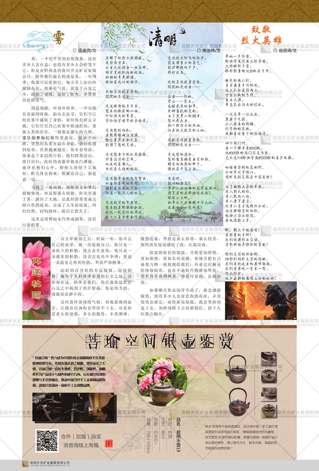 洛陽開元礦業(yè)集團(tuán)有限公司簡介洛陽開元礦業(yè)集團(tuán)有限公司,始成立于2006年,位于洛陽市開元大道269號。集團(tuán)旗下共有五余家全資子公司,業(yè)務(wù)涉及有色金屬礦山開發(fā)、礦產(chǎn)品購銷與進(jìn)出口貿(mào)易、房地產(chǎn)開發(fā)、文化藝術(shù)、企業(yè)管理與咨詢、資本投資等多個領(lǐng)域。民建河南省委委員、民建河南省委企業(yè)委副主任、民建洛陽市委委員、企業(yè)委主任、洛陽民建企業(yè)家協(xié)會會長許明月是公司創(chuàng)始人,現(xiàn)任洛陽開元礦業(yè)集團(tuán)有限公司董事長。在礦業(yè)領(lǐng)域,洛陽開元礦業(yè)集團(tuán)擁有多家實力雄厚的子公司:貴州開元礦業(yè)有限公司探、采礦權(quán)面積共11.33平方公里;興??h銅鑫礦業(yè)有限公司探礦權(quán)面積8.76平方公里,礦山資源潛力巨大;2021年,開元集團(tuán)與盧氏中科礦業(yè)有限公司開展戰(zhàn)略合作。盧氏中科礦業(yè)有限公司專注于有色金屬的浮選、加工和銷售,擁有強(qiáng)大的技術(shù)支撐平臺,是集探、采、選、冶、研為一體的中大型綜合礦業(yè)企業(yè)。目前,盧氏中科王家河1000噸選礦廠已成功投產(chǎn),雙河金礦、柳關(guān)欒盧鉛鋅礦相繼順利開工,樓房銀礦與圪老灣鉛鋅礦的深部探礦重大突破,標(biāo)志著礦山版圖取得重大進(jìn)展,為開元集團(tuán)后續(xù)發(fā)展奠定了堅實基礎(chǔ)。在文化傳媒領(lǐng)域,洛陽市明月美術(shù)館通過豐富多樣的藝術(shù)展覽、學(xué)術(shù)研討和公共教育活動,努力打造一個集展覽、交流、教育、研究為一體的綜合性藝術(shù)平臺。此外,在金融投資領(lǐng)域,開元集團(tuán)旗下的北京明峰資本管理有限公司專注于投資具有高增長潛力的優(yōu)秀企業(yè),特別是高科技、新能源、環(huán)保等新興產(chǎn)業(yè),為客戶提供個性化的資產(chǎn)配置服務(wù)。在做好企業(yè)經(jīng)營的同時,開元集團(tuán)始終不忘企業(yè)的社會責(zé)任和家國情懷,以突出的愛心公益事跡,開展了一系列公益慈善活動:“民建林”公益事業(yè)通過“思源基金”“幫幫公益”線上公益平臺,與眾多愛心人士籌措資金20余萬元;資助541名貧困大學(xué)生共計270余萬元,推進(jìn)“數(shù)字助力——河南AI人才培養(yǎng)”;捐款10萬元,馳援京津冀、黑龍江洪水地質(zhì)災(zāi)害……公司于2017年底被洛陽市慈善總會評為“洛陽慈善風(fēng)云榜——十大愛心集體”。洛陽開元礦業(yè)集團(tuán)有限公司秉承持續(xù)發(fā)展理念,憑借多年來良好的企業(yè)信譽(yù)與經(jīng)營業(yè)績,與全國多家企業(yè)建立了良好合作關(guān)系,受到社會各界的一致好評,多次榮獲“納稅標(biāo)兵”“先進(jìn)企業(yè)”“招商引資模范企業(yè)”等榮譽(yù)稱號。回望來時路,開元人勠力同心,以“闖”的精神和“創(chuàng)”的勁頭,一路披荊斬棘,踏過千山萬水;展望新未來,開元人凝心聚力,不執(zhí)于“舊”,無畏于“新”,秉承“勇于跨越,追求卓越”的企業(yè)精神,乘著國家高質(zhì)量發(fā)展新征程的東風(fēng),跨過高山,越過大海,向著集團(tuán)多元化、國際化的目標(biāo),逐夢遠(yuǎn)航,跨越前行!