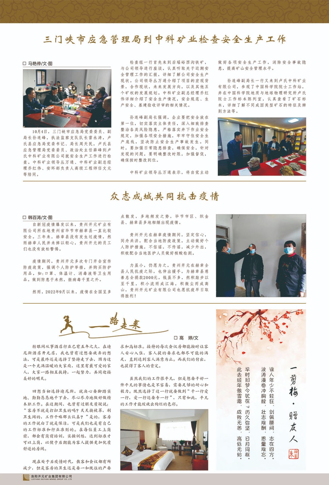 洛陽(yáng)開元礦業(yè)集團(tuán)有限公司簡(jiǎn)介洛陽(yáng)開元礦業(yè)集團(tuán)有限公司,始成立于2006年,位于洛陽(yáng)市開元大道269號(hào)。集團(tuán)旗下共有五余家全資子公司,業(yè)務(wù)涉及有色金屬礦山開發(fā)、礦產(chǎn)品購(gòu)銷與進(jìn)出口貿(mào)易、房地產(chǎn)開發(fā)、文化藝術(shù)、企業(yè)管理與咨詢、資本投資等多個(gè)領(lǐng)域。民建河南省委委員、民建河南省委企業(yè)委副主任、民建洛陽(yáng)市委委員、企業(yè)委主任、洛陽(yáng)民建企業(yè)家協(xié)會(huì)會(huì)長(zhǎng)許明月是公司創(chuàng)始人,現(xiàn)任洛陽(yáng)開元礦業(yè)集團(tuán)有限公司董事長(zhǎng)。在礦業(yè)領(lǐng)域,洛陽(yáng)開元礦業(yè)集團(tuán)擁有多家實(shí)力雄厚的子公司:貴州開元礦業(yè)有限公司探、采礦權(quán)面積共11.33平方公里;興??h銅鑫礦業(yè)有限公司探礦權(quán)面積8.76平方公里,礦山資源潛力巨大;2021年,開元集團(tuán)與盧氏中科礦業(yè)有限公司開展戰(zhàn)略合作。盧氏中科礦業(yè)有限公司專注于有色金屬的浮選、加工和銷售,擁有強(qiáng)大的技術(shù)支撐平臺(tái),是集探、采、選、冶、研為一體的中大型綜合礦業(yè)企業(yè)。目前,盧氏中科王家河1000噸選礦廠已成功投產(chǎn),雙河金礦、柳關(guān)欒盧鉛鋅礦相繼順利開工,樓房銀礦與圪老灣鉛鋅礦的深部探礦重大突破,標(biāo)志著礦山版圖取得重大進(jìn)展,為開元集團(tuán)后續(xù)發(fā)展奠定了堅(jiān)實(shí)基礎(chǔ)。在文化傳媒領(lǐng)域,洛陽(yáng)市明月美術(shù)館通過豐富多樣的藝術(shù)展覽、學(xué)術(shù)研討和公共教育活動(dòng),努力打造一個(gè)集展覽、交流、教育、研究為一體的綜合性藝術(shù)平臺(tái)。此外,在金融投資領(lǐng)域,開元集團(tuán)旗下的北京明峰資本管理有限公司專注于投資具有高增長(zhǎng)潛力的優(yōu)秀企業(yè),特別是高科技、新能源、環(huán)保等新興產(chǎn)業(yè),為客戶提供個(gè)性化的資產(chǎn)配置服務(wù)。在做好企業(yè)經(jīng)營(yíng)的同時(shí),開元集團(tuán)始終不忘企業(yè)的社會(huì)責(zé)任和家國(guó)情懷,以突出的愛心公益事跡,開展了一系列公益慈善活動(dòng):“民建林”公益事業(yè)通過“思源基金”“幫幫公益”線上公益平臺(tái),與眾多愛心人士籌措資金20余萬(wàn)元;資助541名貧困大學(xué)生共計(jì)270余萬(wàn)元,推進(jìn)“數(shù)字助力——河南AI人才培養(yǎng)”;捐款10萬(wàn)元,馳援京津冀、黑龍江洪水地質(zhì)災(zāi)害……公司于2017年底被洛陽(yáng)市慈善總會(huì)評(píng)為“洛陽(yáng)慈善風(fēng)云榜——十大愛心集體”。洛陽(yáng)開元礦業(yè)集團(tuán)有限公司秉承持續(xù)發(fā)展理念,憑借多年來良好的企業(yè)信譽(yù)與經(jīng)營(yíng)業(yè)績(jī),與全國(guó)多家企業(yè)建立了良好合作關(guān)系,受到社會(huì)各界的一致好評(píng),多次榮獲“納稅標(biāo)兵”“先進(jìn)企業(yè)”“招商引資模范企業(yè)”等榮譽(yù)稱號(hào)?;赝麃頃r(shí)路,開元人勠力同心,以“闖”的精神和“創(chuàng)”的勁頭,一路披荊斬棘,踏過千山萬(wàn)水;展望新未來,開元人凝心聚力,不執(zhí)于“舊”,無畏于“新”,秉承“勇于跨越,追求卓越”的企業(yè)精神,乘著國(guó)家高質(zhì)量發(fā)展新征程的東風(fēng),跨過高山,越過大海,向著集團(tuán)多元化、國(guó)際化的目標(biāo),逐夢(mèng)遠(yuǎn)航,跨越前行!