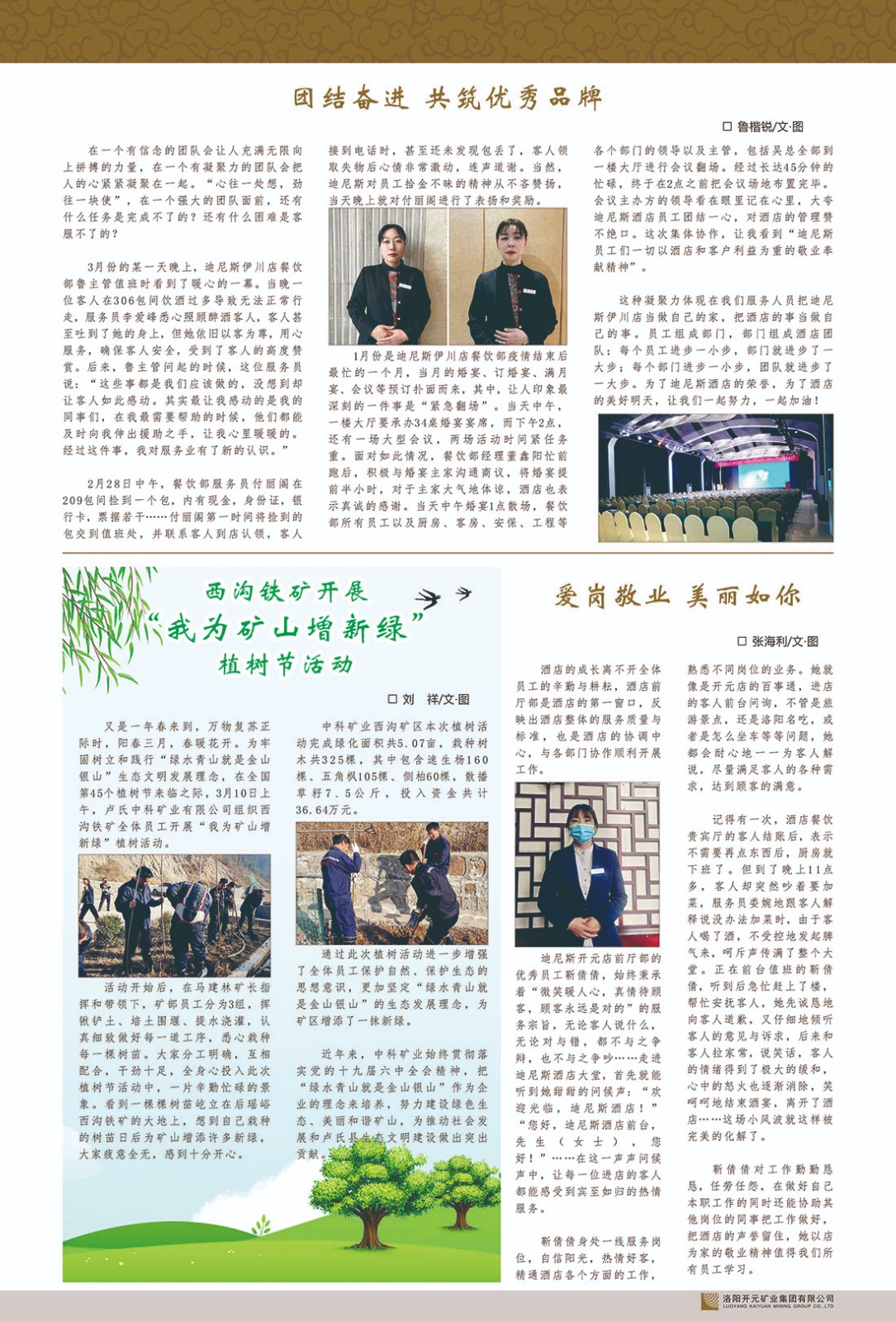 洛陽開元礦業(yè)集團(tuán)有限公司簡介洛陽開元礦業(yè)集團(tuán)有限公司,始成立于2006年,位于洛陽市開元大道269號。集團(tuán)旗下共有五余家全資子公司,業(yè)務(wù)涉及有色金屬礦山開發(fā)、礦產(chǎn)品購銷與進(jìn)出口貿(mào)易、房地產(chǎn)開發(fā)、文化藝術(shù)、企業(yè)管理與咨詢、資本投資等多個領(lǐng)域。民建河南省委委員、民建河南省委企業(yè)委副主任、民建洛陽市委委員、企業(yè)委主任、洛陽民建企業(yè)家協(xié)會會長許明月是公司創(chuàng)始人,現(xiàn)任洛陽開元礦業(yè)集團(tuán)有限公司董事長。在礦業(yè)領(lǐng)域,洛陽開元礦業(yè)集團(tuán)擁有多家實(shí)力雄厚的子公司:貴州開元礦業(yè)有限公司探、采礦權(quán)面積共11.33平方公里;興??h銅鑫礦業(yè)有限公司探礦權(quán)面積8.76平方公里,礦山資源潛力巨大;2021年,開元集團(tuán)與盧氏中科礦業(yè)有限公司開展戰(zhàn)略合作。盧氏中科礦業(yè)有限公司專注于有色金屬的浮選、加工和銷售,擁有強(qiáng)大的技術(shù)支撐平臺,是集探、采、選、冶、研為一體的中大型綜合礦業(yè)企業(yè)。目前,盧氏中科王家河1000噸選礦廠已成功投產(chǎn),雙河金礦、柳關(guān)欒盧鉛鋅礦相繼順利開工,樓房銀礦與圪老灣鉛鋅礦的深部探礦重大突破,標(biāo)志著礦山版圖取得重大進(jìn)展,為開元集團(tuán)后續(xù)發(fā)展奠定了堅實(shí)基礎(chǔ)。在文化傳媒領(lǐng)域,洛陽市明月美術(shù)館通過豐富多樣的藝術(shù)展覽、學(xué)術(shù)研討和公共教育活動,努力打造一個集展覽、交流、教育、研究為一體的綜合性藝術(shù)平臺。此外,在金融投資領(lǐng)域,開元集團(tuán)旗下的北京明峰資本管理有限公司專注于投資具有高增長潛力的優(yōu)秀企業(yè),特別是高科技、新能源、環(huán)保等新興產(chǎn)業(yè),為客戶提供個性化的資產(chǎn)配置服務(wù)。在做好企業(yè)經(jīng)營的同時,開元集團(tuán)始終不忘企業(yè)的社會責(zé)任和家國情懷,以突出的愛心公益事跡,開展了一系列公益慈善活動:“民建林”公益事業(yè)通過“思源基金”“幫幫公益”線上公益平臺,與眾多愛心人士籌措資金20余萬元;資助541名貧困大學(xué)生共計270余萬元,推進(jìn)“數(shù)字助力——河南AI人才培養(yǎng)”;捐款10萬元,馳援京津冀、黑龍江洪水地質(zhì)災(zāi)害……公司于2017年底被洛陽市慈善總會評為“洛陽慈善風(fēng)云榜——十大愛心集體”。洛陽開元礦業(yè)集團(tuán)有限公司秉承持續(xù)發(fā)展理念,憑借多年來良好的企業(yè)信譽(yù)與經(jīng)營業(yè)績,與全國多家企業(yè)建立了良好合作關(guān)系,受到社會各界的一致好評,多次榮獲“納稅標(biāo)兵”“先進(jìn)企業(yè)”“招商引資模范企業(yè)”等榮譽(yù)稱號?;赝麃頃r路,開元人勠力同心,以“闖”的精神和“創(chuàng)”的勁頭,一路披荊斬棘,踏過千山萬水;展望新未來,開元人凝心聚力,不執(zhí)于“舊”,無畏于“新”,秉承“勇于跨越,追求卓越”的企業(yè)精神,乘著國家高質(zhì)量發(fā)展新征程的東風(fēng),跨過高山,越過大海,向著集團(tuán)多元化、國際化的目標(biāo),逐夢遠(yuǎn)航,跨越前行!