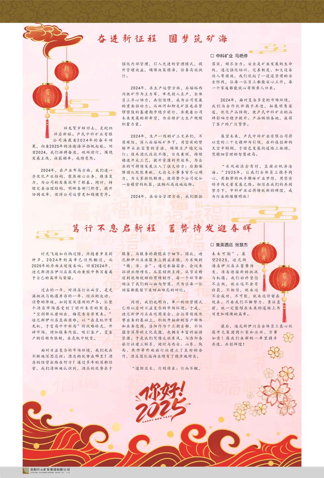 洛陽開元礦業(yè)集團有限公司簡介洛陽開元礦業(yè)集團有限公司,始成立于2006年,位于洛陽市開元大道269號。集團旗下共有五余家全資子公司,業(yè)務涉及有色金屬礦山開發(fā)、礦產品購銷與進出口貿易、房地產開發(fā)、文化藝術、企業(yè)管理與咨詢、資本投資等多個領域。民建河南省委委員、民建河南省委企業(yè)委副主任、民建洛陽市委委員、企業(yè)委主任、洛陽民建企業(yè)家協(xié)會會長許明月是公司創(chuàng)始人,現(xiàn)任洛陽開元礦業(yè)集團有限公司董事長。在礦業(yè)領域,洛陽開元礦業(yè)集團擁有多家實力雄厚的子公司:貴州開元礦業(yè)有限公司探、采礦權面積共11.33平方公里;興??h銅鑫礦業(yè)有限公司探礦權面積8.76平方公里,礦山資源潛力巨大;2021年,開元集團與盧氏中科礦業(yè)有限公司開展戰(zhàn)略合作。盧氏中科礦業(yè)有限公司專注于有色金屬的浮選、加工和銷售,擁有強大的技術支撐平臺,是集探、采、選、冶、研為一體的中大型綜合礦業(yè)企業(yè)。目前,盧氏中科王家河1000噸選礦廠已成功投產,雙河金礦、柳關欒盧鉛鋅礦相繼順利開工,樓房銀礦與圪老灣鉛鋅礦的深部探礦重大突破,標志著礦山版圖取得重大進展,為開元集團后續(xù)發(fā)展奠定了堅實基礎。在文化傳媒領域,洛陽市明月美術館通過豐富多樣的藝術展覽、學術研討和公共教育活動,努力打造一個集展覽、交流、教育、研究為一體的綜合性藝術平臺。此外,在金融投資領域,開元集團旗下的北京明峰資本管理有限公司專注于投資具有高增長潛力的優(yōu)秀企業(yè),特別是高科技、新能源、環(huán)保等新興產業(yè),為客戶提供個性化的資產配置服務。在做好企業(yè)經營的同時,開元集團始終不忘企業(yè)的社會責任和家國情懷,以突出的愛心公益事跡,開展了一系列公益慈善活動:“民建林”公益事業(yè)通過“思源基金”“幫幫公益”線上公益平臺,與眾多愛心人士籌措資金20余萬元;資助541名貧困大學生共計270余萬元,推進“數(shù)字助力——河南AI人才培養(yǎng)”;捐款10萬元,馳援京津冀、黑龍江洪水地質災害……公司于2017年底被洛陽市慈善總會評為“洛陽慈善風云榜——十大愛心集體”。洛陽開元礦業(yè)集團有限公司秉承持續(xù)發(fā)展理念,憑借多年來良好的企業(yè)信譽與經營業(yè)績,與全國多家企業(yè)建立了良好合作關系,受到社會各界的一致好評,多次榮獲“納稅標兵”“先進企業(yè)”“招商引資模范企業(yè)”等榮譽稱號?;赝麃頃r路,開元人勠力同心,以“闖”的精神和“創(chuàng)”的勁頭,一路披荊斬棘,踏過千山萬水;展望新未來,開元人凝心聚力,不執(zhí)于“舊”,無畏于“新”,秉承“勇于跨越,追求卓越”的企業(yè)精神,乘著國家高質量發(fā)展新征程的東風,跨過高山,越過大海,向著集團多元化、國際化的目標,逐夢遠航,跨越前行!